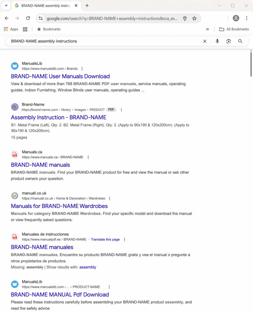 The image is of a Google search for the assembly instructions for an international furniture company, we’ve changed their name to BRAND-NAME for the purposes of this article.